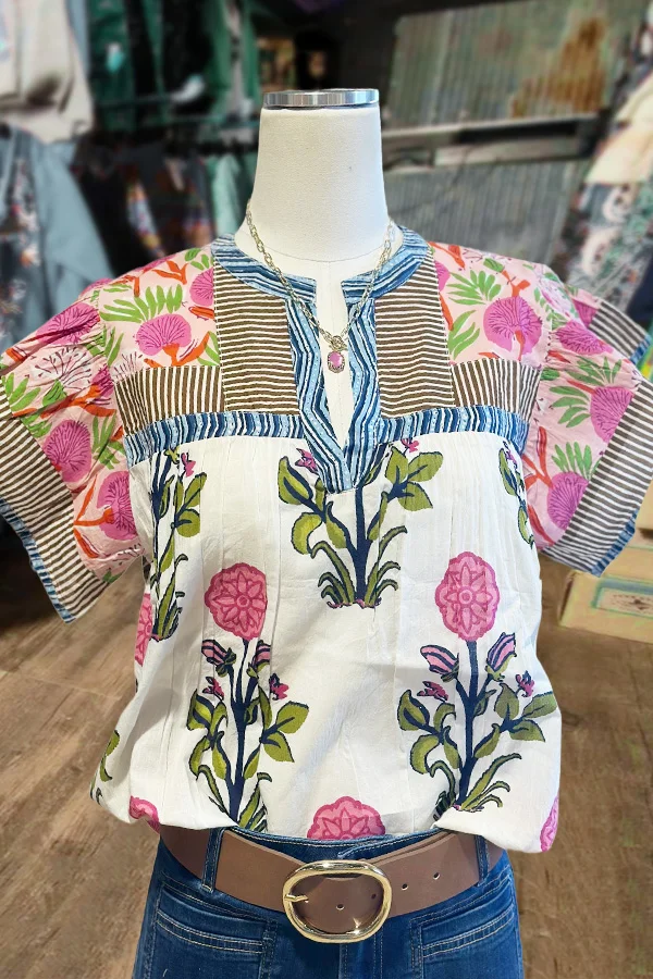 Mixed Floral Print Split Neck Top